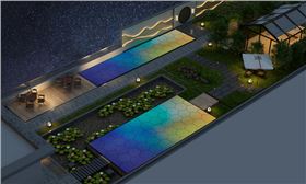 光能寶盒發(fā)電系統(tǒng)安裝在建筑屋頂,直接代替屋頂隔熱磚,人可以在上面自由活動(dòng),白天發(fā)的電,經(jīng)過(guò)逆變器升壓后,直接供給建筑室內(nèi)設(shè)備用電;光能寶盒鋪安裝在外墻,可直接代替外墻磚。與建筑融為一體,形成光伏建筑一體化,白天發(fā)電,晚上發(fā)亮。光能寶盒發(fā)電系統(tǒng)安裝在人行通道夜間亮化效果,亮化模式通過(guò)手機(jī) APP 進(jìn)行調(diào)節(jié),還可以和音樂(lè)噴泉一樣,和音樂(lè)形成互動(dòng)。根據(jù)不同的場(chǎng)景調(diào)節(jié)顏色,不同的音樂(lè)節(jié)奏而變化。