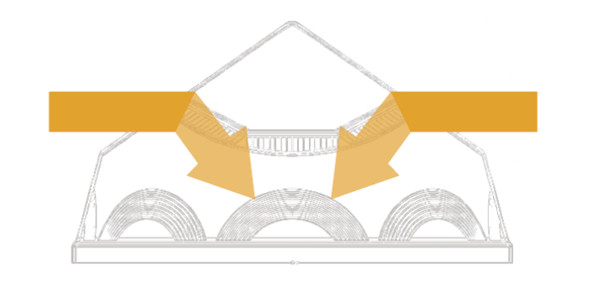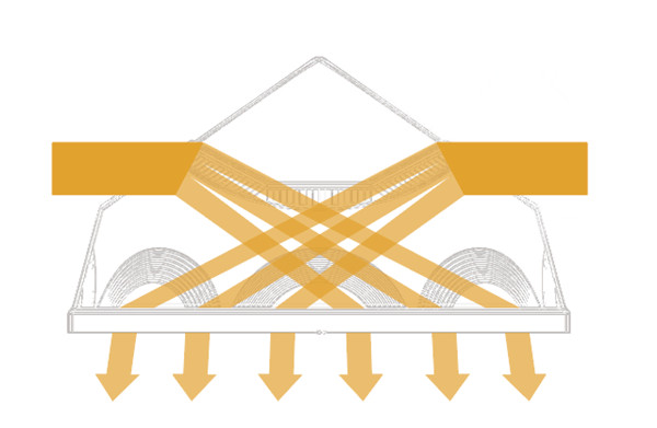 不僅使上午及下午陽光轉(zhuǎn)向?qū)?,還對光線進行聚焦,提高采光效率。